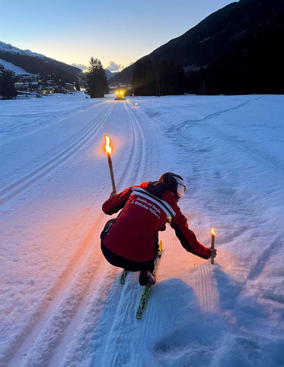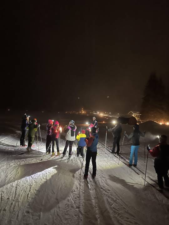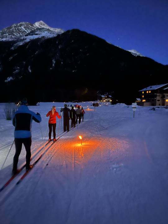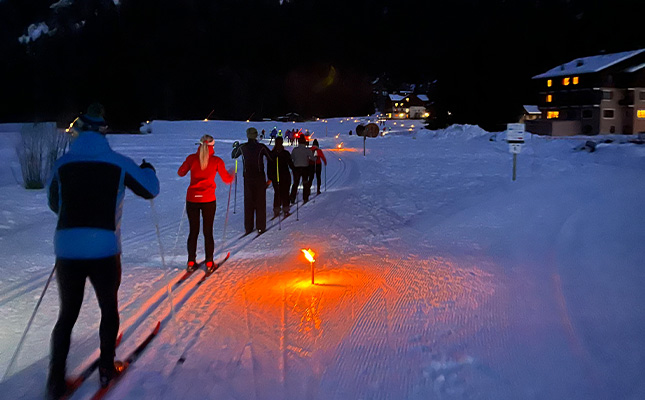 La pista di sci di fondo sarà illuminata dalla luce delle fiaccole, dalla luna piena e dalle stelle. I maestri vi aspettano e vi accompagneranno in una suggestiva sciata in notturna.